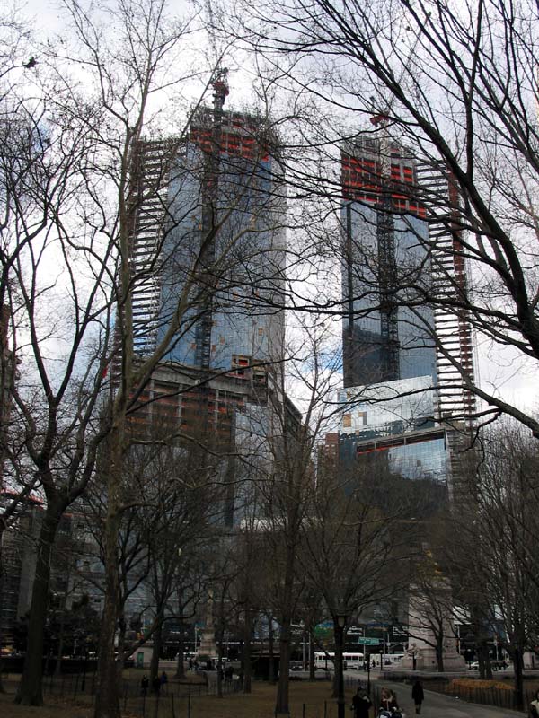 AOL Time Warner Center is rising behind the Trump International Hotel & Tower. On the left Random House/Park Imperial is nearing completion. The view across Central Park's Sheep Meadow on 21 April 2002.