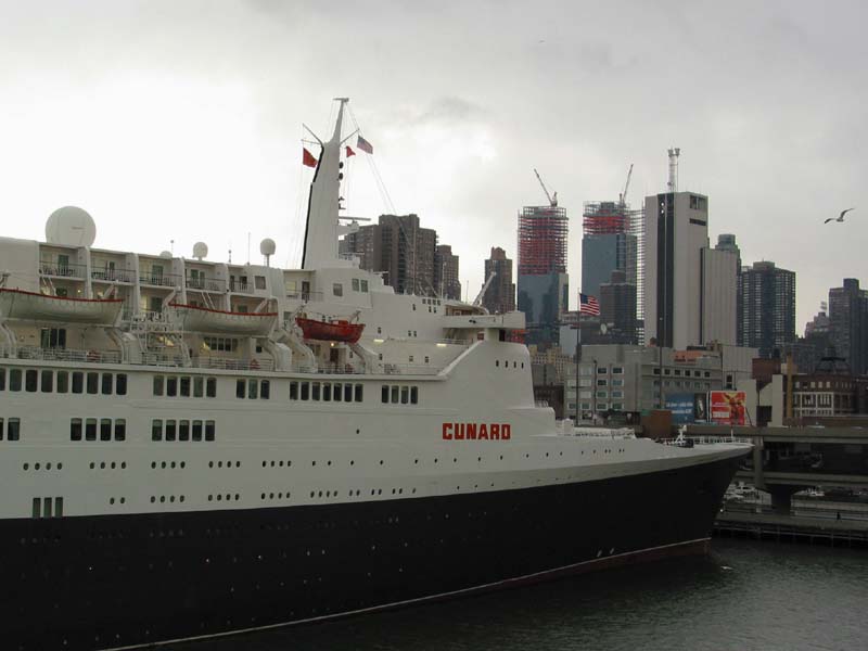 Queen Elizabeth 2, the flagship vessel of Cunard, at Pier 90, on the way to Caribbean. Time Warner Center twin towers beyond. 21 December 2002.
