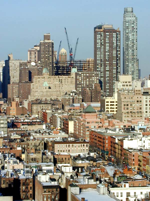 The view of Time Warner Center and the roofs of Hell's Kitchen from 420 W 42nd Street rental apartment building on 20 January 2002.